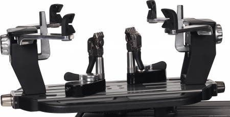 auch die seitlichen Rahmenhalterungen werden nur mit einem Drehrad pro Seite eingestellt und zentriert. Wobei auf diesem Bild die Schienen auf denen die Zangen laufen noch gerade sind. Beim 2013er Modell sind diese gebogen um das Beisaiten noch einfacher zu machen: