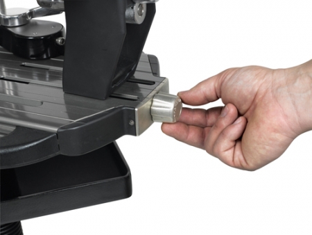 1. Zwei selbstzentrierende Standsäulen per Drehrad. Dies erleichtert und verkürzt beim Besaiten verschieden großer Schläger sehr stark den Arbeitsaufwand. (siehe Bild Nr. 7)