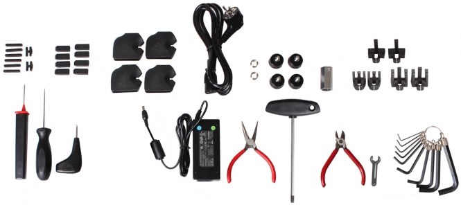 Inkl. Komplettes Werkzeugpaket (Hohlahle, Ahle, Spitzzange, Saitenschneider, Inbusschlüssel, 4 x Badmintonaufsätze für seitlichen Rahmenfixierungen, + Badmintonaufsätze (Load Spreader) für die Kopf-/Herzfixierungen.
