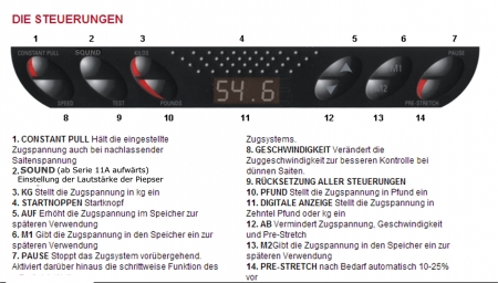 - Zwei stationäre Mittelhaltezangen, 360° drehbar mit 5 Zacken und einer breiten Festhaltefläche, sorgen für ein saitenschonendes fixieren der Saite. Die Mittelhaltzangen& haben kleine Noppen um die Saite ohne viel Druck gut halten zu können und ein durchrutschen der Saite zu verhindern