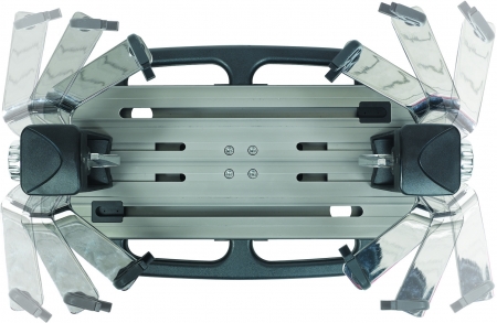 auch die seitlichen Rahmenhalterungen werden nur mit einem Drehrad pro Seite eingestellt und zentriert. Wobei auf diesem Bild die Schienen auf denen die Zangen laufen noch gerade sind. Beim 2013er Modell sind diese gebogen um das Beisaiten noch einfacher zu machen:
