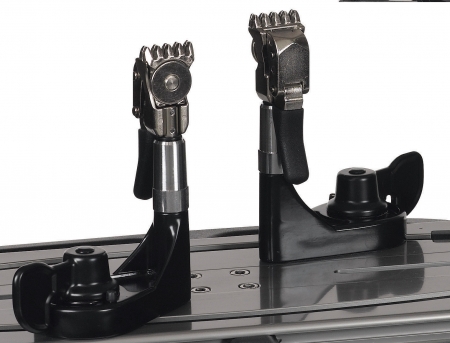 1. Zwei selbstzentrierende Standsäulen per Drehrad. Dies erleichtert und verkürzt beim Besaiten verschieden großer Schläger sehr stark den Arbeitsaufwand. (siehe Bild Nr. 7)