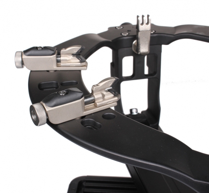 Sehr hochwertige feststellbare V-förmige Rahmenhalterungen und high end Herz-/Kopffixierungen (Loadspreader) für Badminton