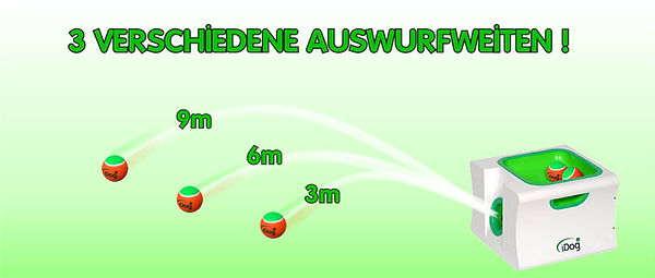 iDog wirft die Bälle in 3 verschieden einstellbare Auswurfweiten aus. 3 Meter, 6 Meter, 9 Meter (mit weichen Bällen und im Akkubetrieb evtl. kürzer)*