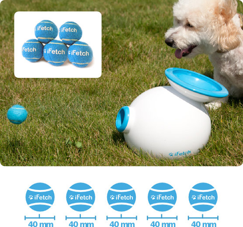 - iFetch ist designed für kleine Tennisbälle (nicht die original Größe) die eine Größe wie Squashbälle (funktionieren auch) haben. Es gibt auch bei manchen Tierhandlungen kleine weiche Bälle die passen (werden aber dafür nicht weit ausgeworfen)